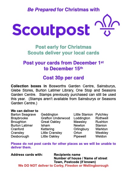 After a year out due to Covid, Burton Latimer Scout Christmas post is back for 2021. Please see below for full details. If you think you can help out with the delivery of the cards, please speak to your section leader.