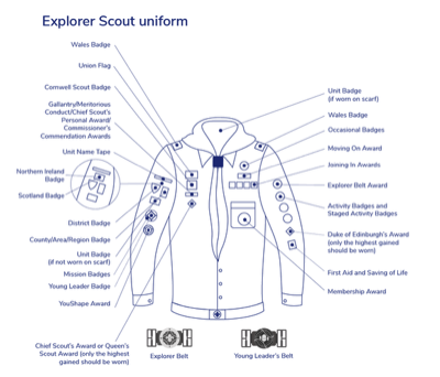 Once they’ve had time to settle in to the group, Explorers get their own set of uniform to wear during meetings and on trips away. Usually, this consists of a beige shirt or blouse with their badges sewn on, which they pair with their Unit scarf – if they’re an independent Unit - or Group scarf, if their Unit is merged with a Scout Troop. This will vary slightly if your Explorer Unit is part of the Air Scouts or Sea Scouts. See below for uniform diagrams.